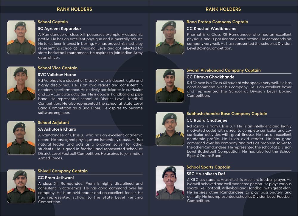 Thereafter, an impressive Investiture Ceremony was held to present badges of ranks to the Ramdandee Appointments. Col Baljeet Singh, Mr Rahul Dixit, Secretary CHMES Nagpur, Col Amarendra Hardas, Commandant, Mr Ajay Shirke, Head Master Bhonsala Military School, Dr J S Riar, Principal Bhonsala Sainik School, Nagpur presented the badges of ranks and baton to the school appointments and company appointments.