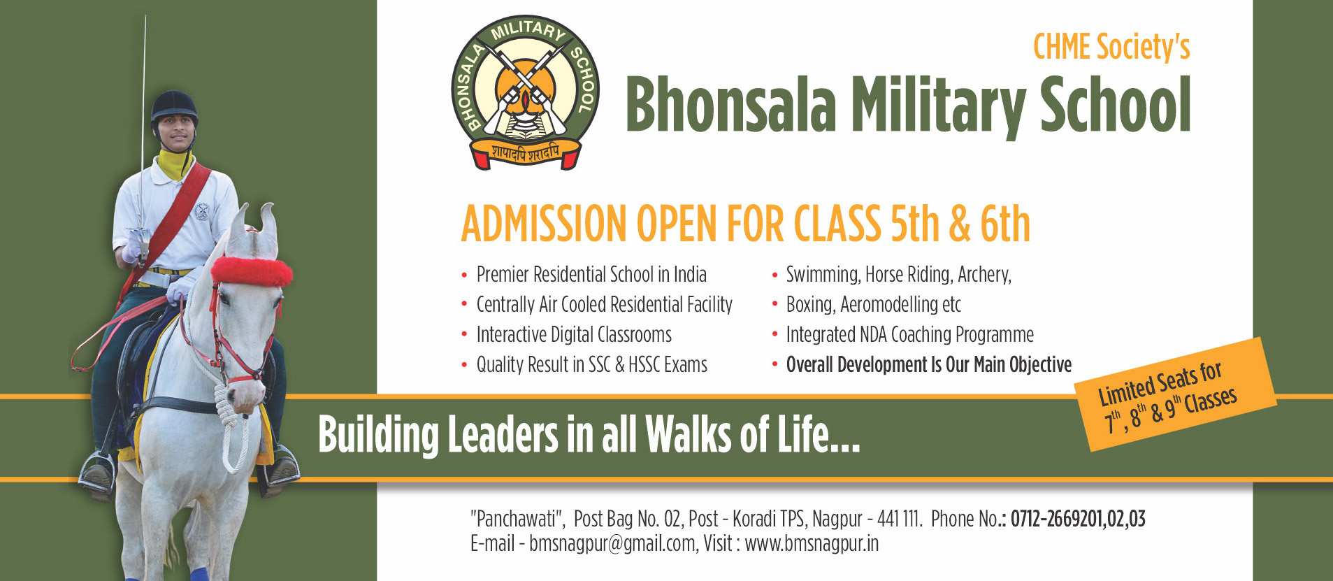 Bhonsala Military School, Nagpur was established on June 1996 and on 15th Nov 1999 it moved into its present campus located over 30 acres of lush green land at ‘Panchawati’, Near Village Chakki Khapa, Koradi, Nagpur away from the din and grind of the city.